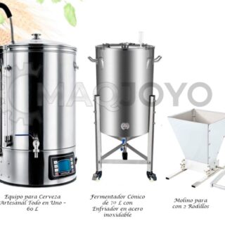 Kit 8: Equipo para Cerveza Artesanal Todo en Uno 60 L + Fermentador Presurizado 65 L + Molino para Malta con 2 Rodillos