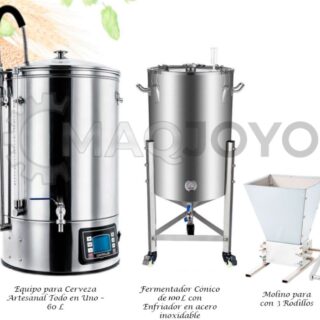 Kit cervecero 10: Equipo para Cerveza Artesanal Todo en Uno 60 L + Fermentador Cónico de 100 L con Enfriador en acero inoxidable + Molino para Malta con 3 Rodillos