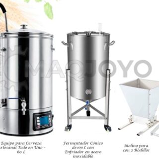 Kit cervecero 9: Equipo para Cerveza Artesanal Todo en Uno 60 L + Fermentador Cónico de 100 L con Enfriador en acero inoxidable + Molino para Malta con 2 Rodillos