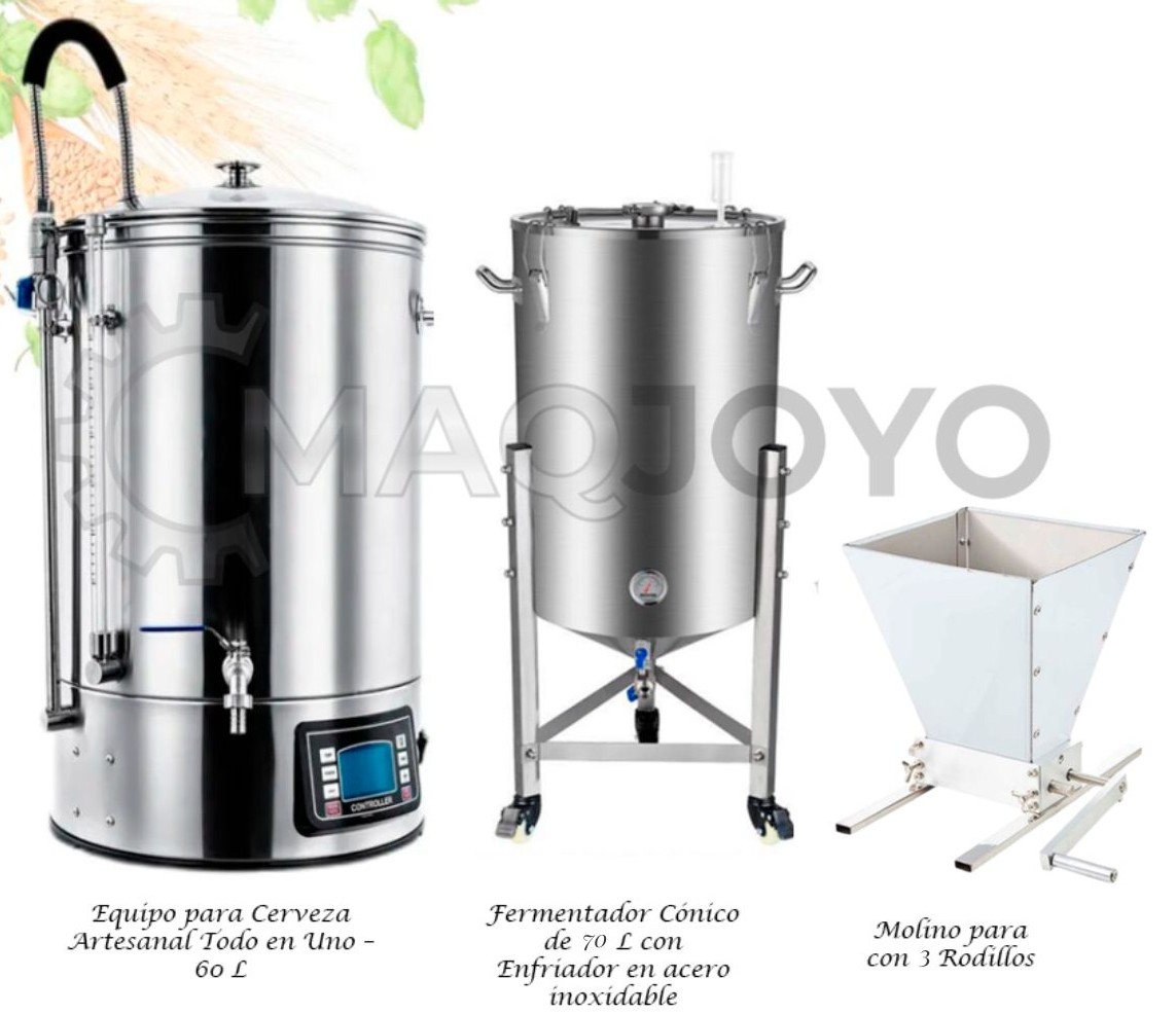 Kit cervecero 1: Equipo para Cerveza Artesanal Todo en Uno 60 L + Fermentador Cónico de 70 L con Enfriador en acero inoxidable + Molino para Malta con 3 Rodillos