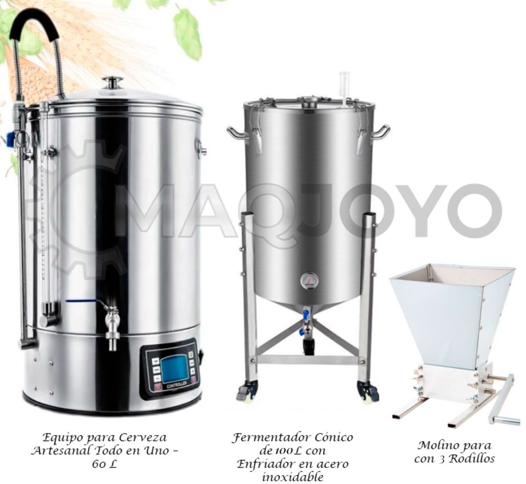 Kit cervecero 10: Equipo para Cerveza Artesanal Todo en Uno 60 L + Fermentador Cónico de 100 L con Enfriador en acero inoxidable + Molino para Malta con 3 Rodillos